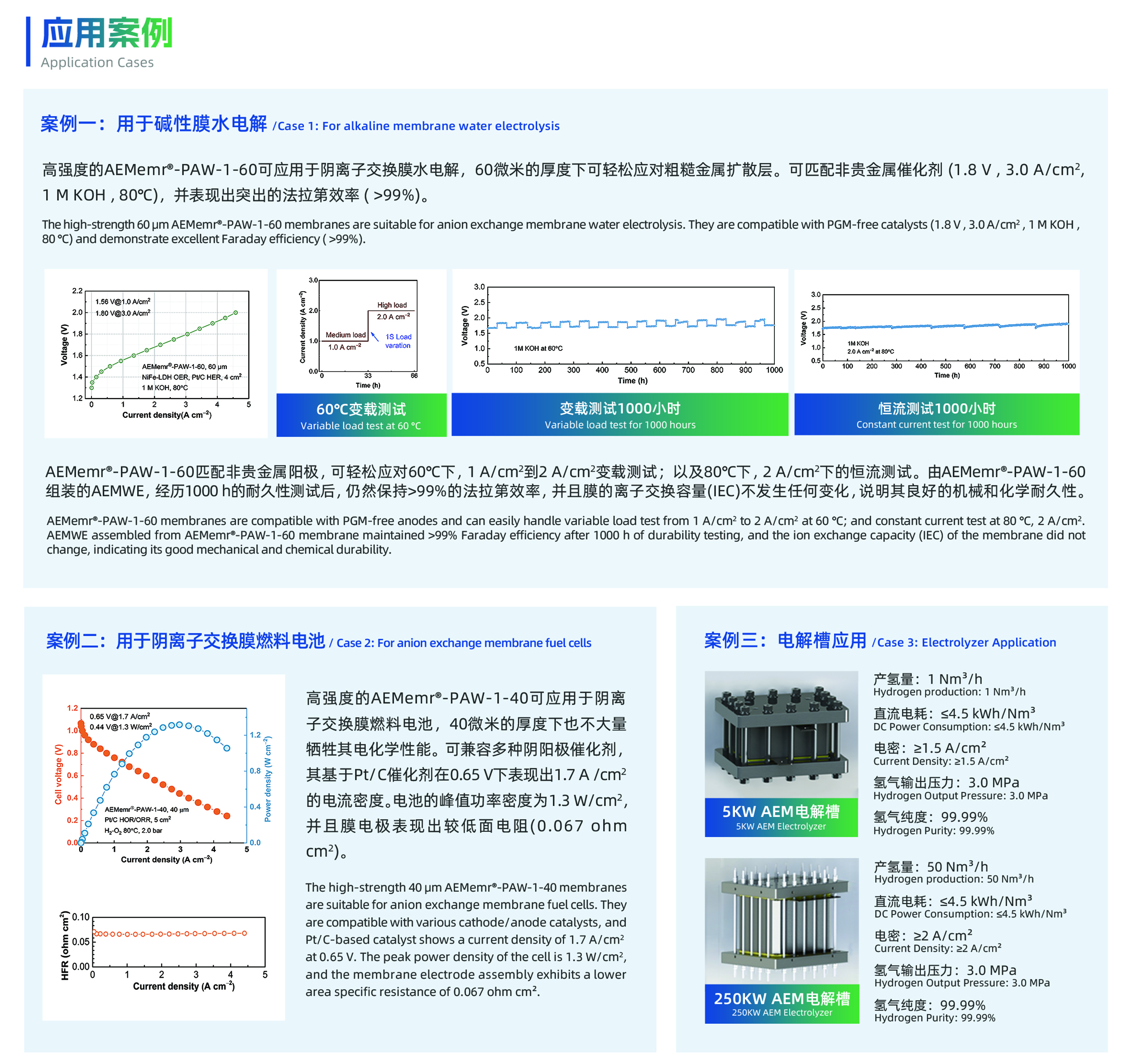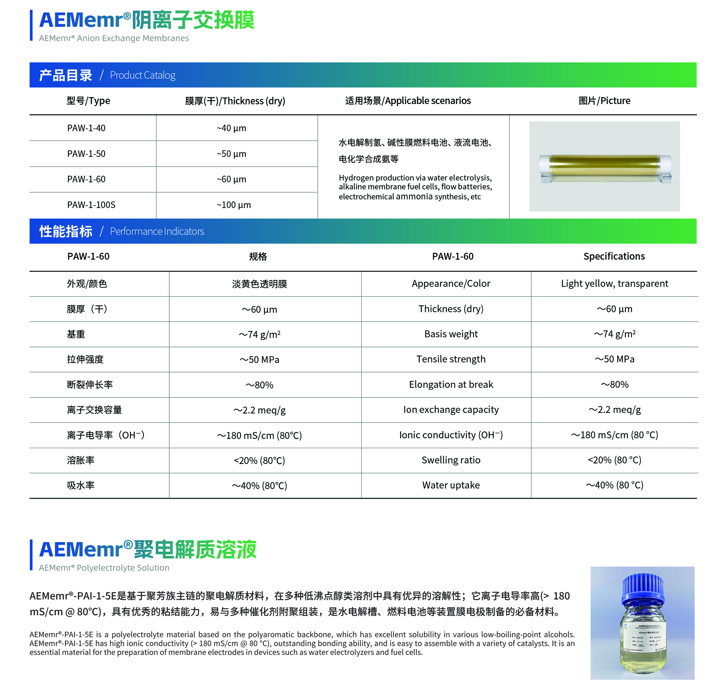永利中国氢友专注于阴离子交换膜的研发、生产与销售。其开发的AEMemr®系列产品已实现卷对卷连续生产,具有离子传导率高(180 mS/cm,OH¯形式,80°C)、碱稳定性高(10000+ h,1 M KOH,80°C)和机械强度高(50 MPa stress,>80% strain)等特点,可应用于水电解制氢、碱性膜燃料电池、液流电池、电化学合成氨以及水处理等多个领域。